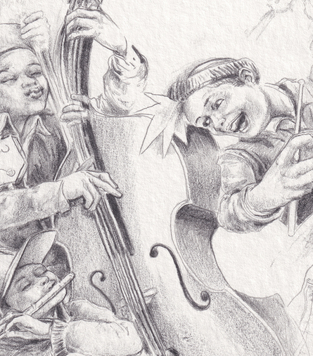 Auch Klang scheint mitzuschwingen: Hinweise auf musikalische Kommunikation und rhythmische Strukturen deuten eine Ebene an, die über das Sichtbare hinausgeht und das Geschehen in eine gemeinsame Resonanz versetzt.